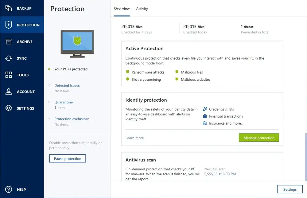 Complete AI based cyber protection, including antivirus and ransomware protection.